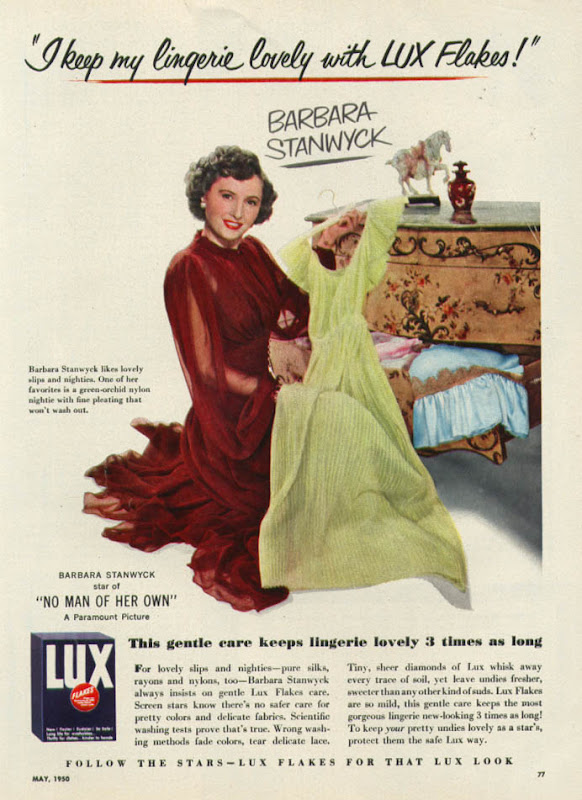 FlowerBell - But Lux Flakes leave your "undies frehser, sweeter than any other flakes"! Even leprosy!David Toms - She's not a featured Lux gal, but one suspects that Miss Crawford did.Poseidon3 - I'm going to take my prettiest undies and do a Lux vs. Other Leading Flakes test today. I'll let you know how it turns out.normadesmond - Yes, here at SSUWAT, we strive to be entertaining and informative!MJ - Only to shop for gifts pour vous.